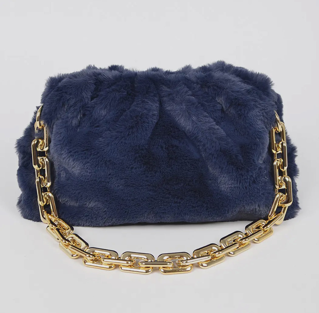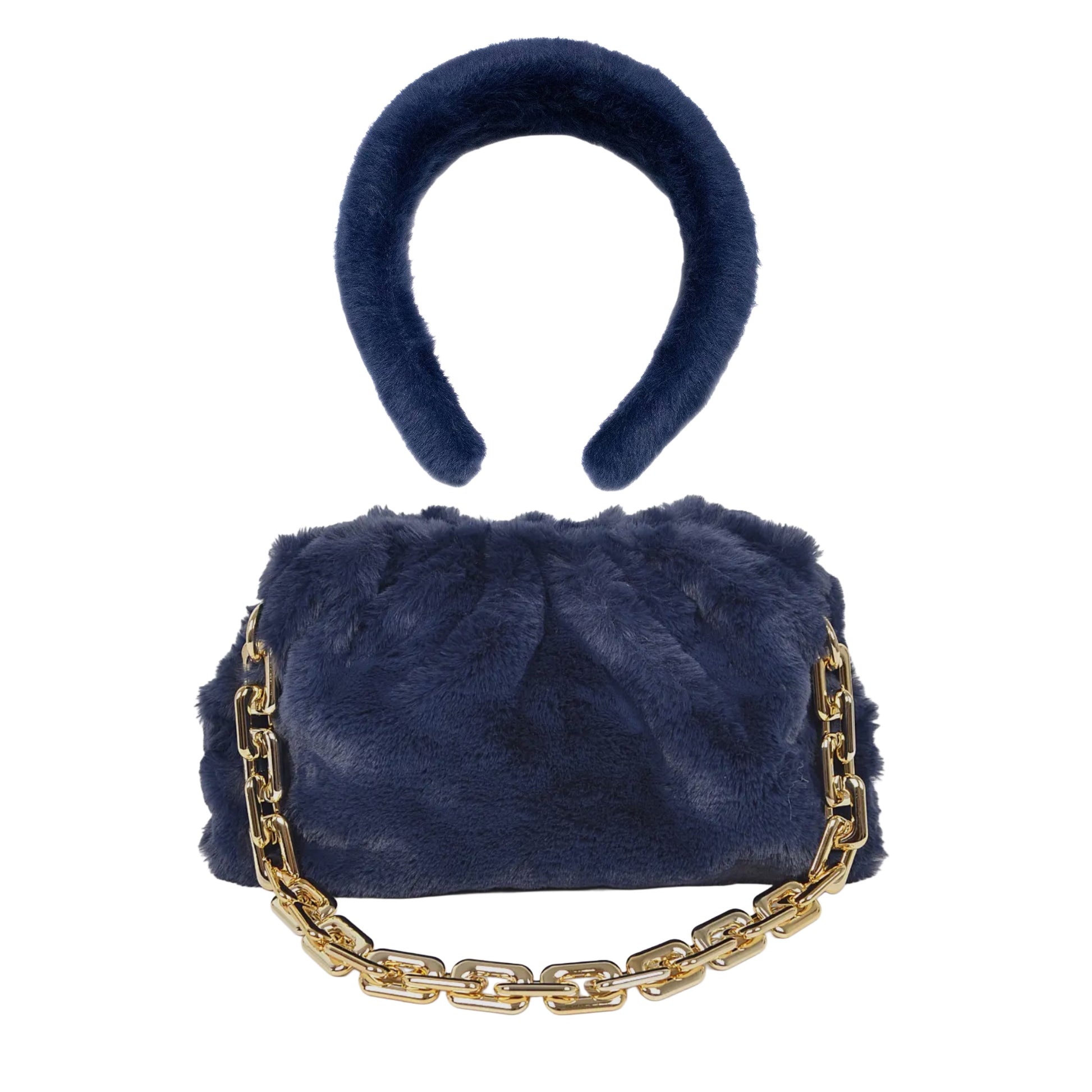 Indulge in luxurious plush with our "Pretty in Plush" set. This exquisite navy faux fur handbag comes with a detachable gold chain for effortless style and practicality. Complete your look with the matching headband and elevate any outfit to a whole new level of sophistication.